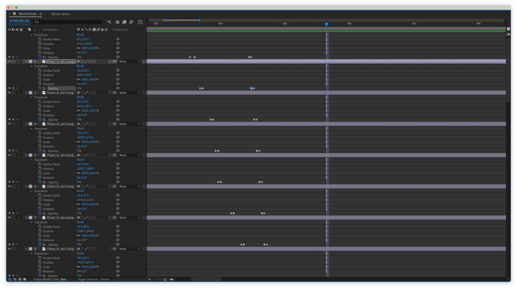 Once I had these cutout, I took them into After Effects and began to place them where there were in the original image but on a blank slate. I am sure there are easier ways to this, however I just imported the original image and laid them over top, once done I removed the background layer.