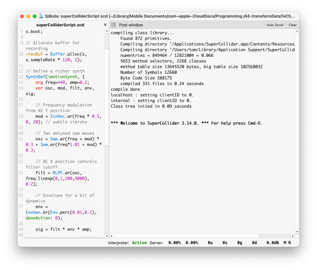 This allowed me to create synths and other electronic noise, or “music” at a very low level. With script I was able to feed a very simple oscillator the data of the x, y, position of the track that affect the pitch of the OSC.