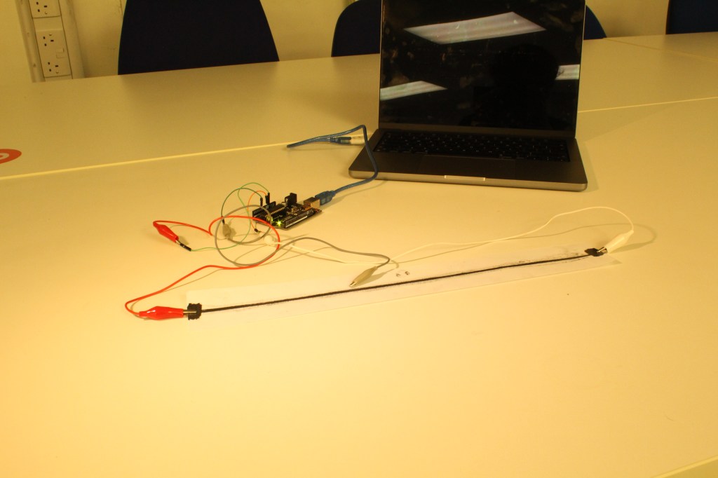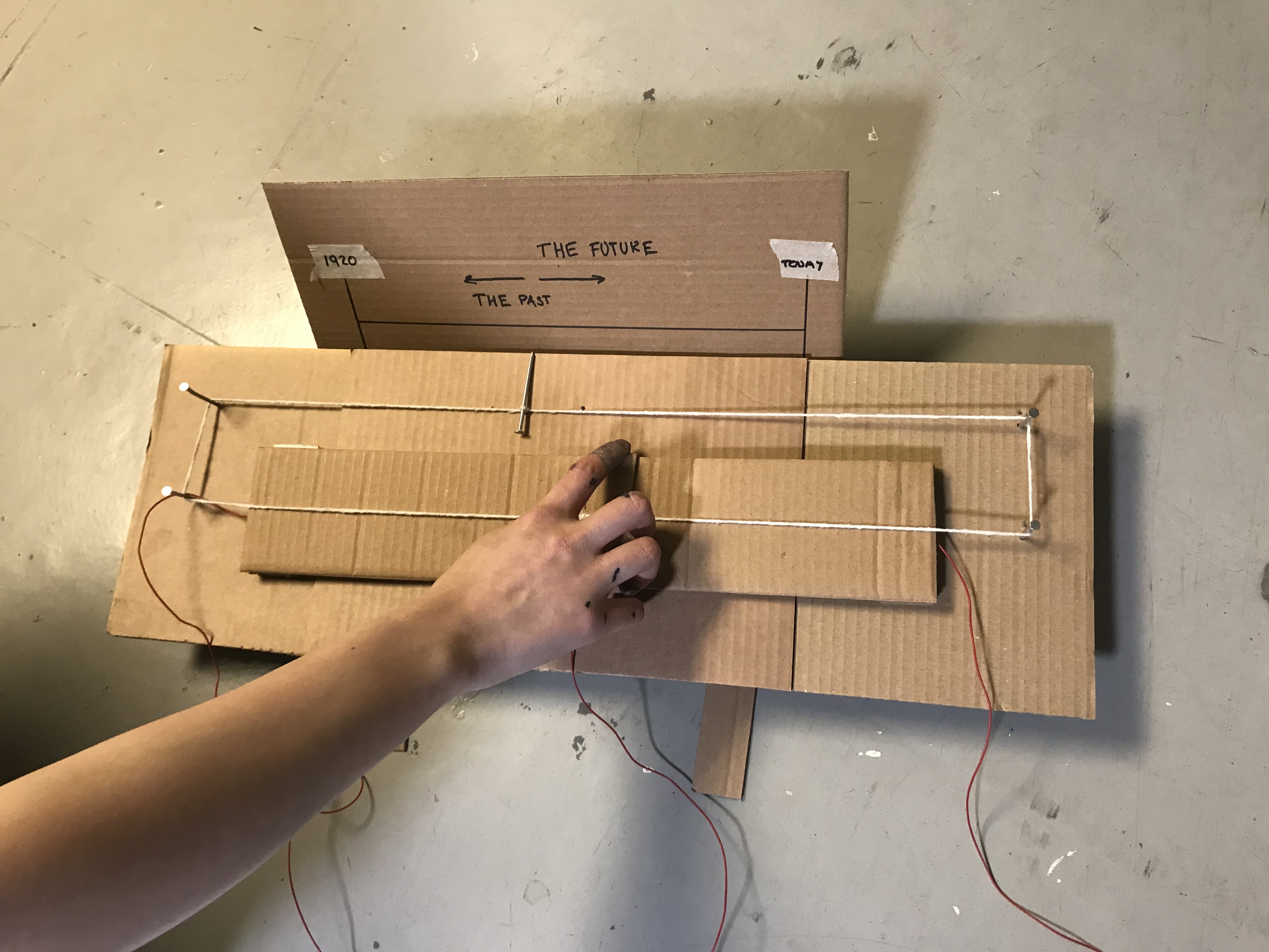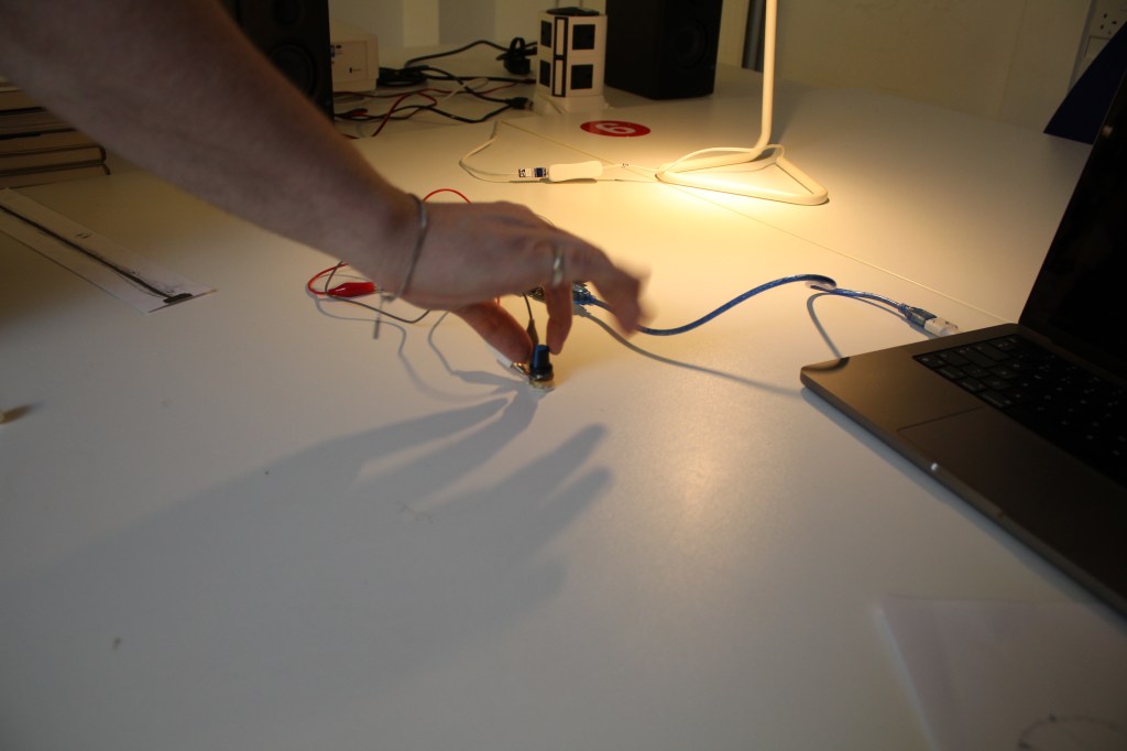 However, with some advice from my tutors at a review it was clear that a linear potentiometer ties in much better to the idea of moving along a linear timeline. At first, I thought of the standard linear potentiometers that you might use to control volume etc. but I soon realised that I wanted it to be bigger. Using a graphite pencil, I created my very own potentiometer that worked just as well but I was able to control the size of it much better.