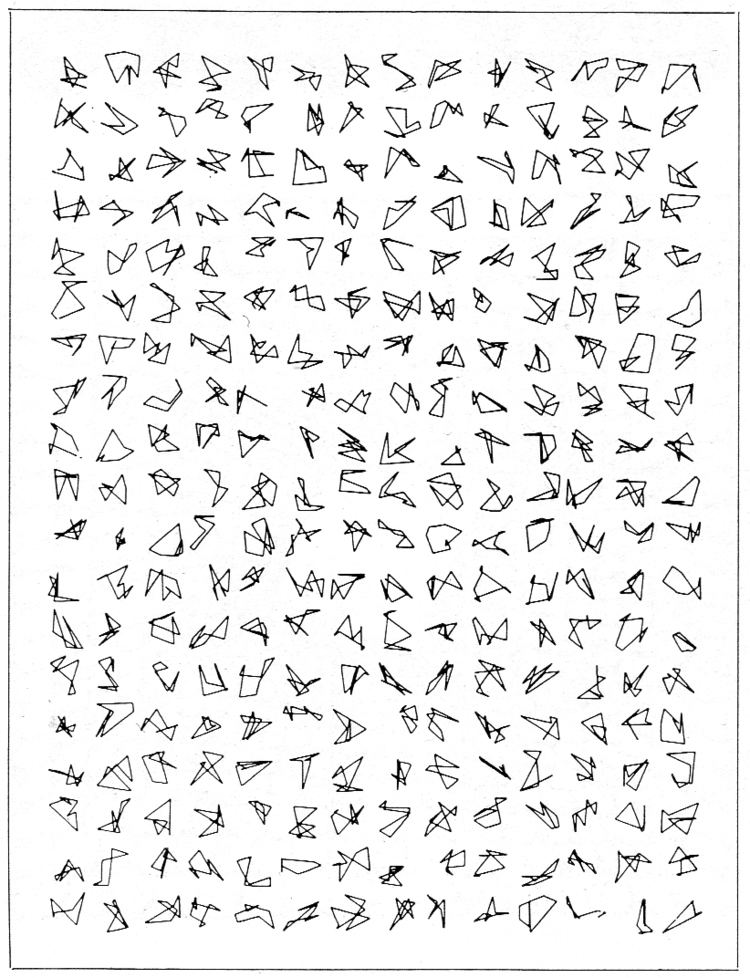 From here I wanted to combine both techniques from workshop 3, grids and vertexes. George Nees is someone else we looked at so just like the Vera Molnár piece above I wanted to recreate one of his works.