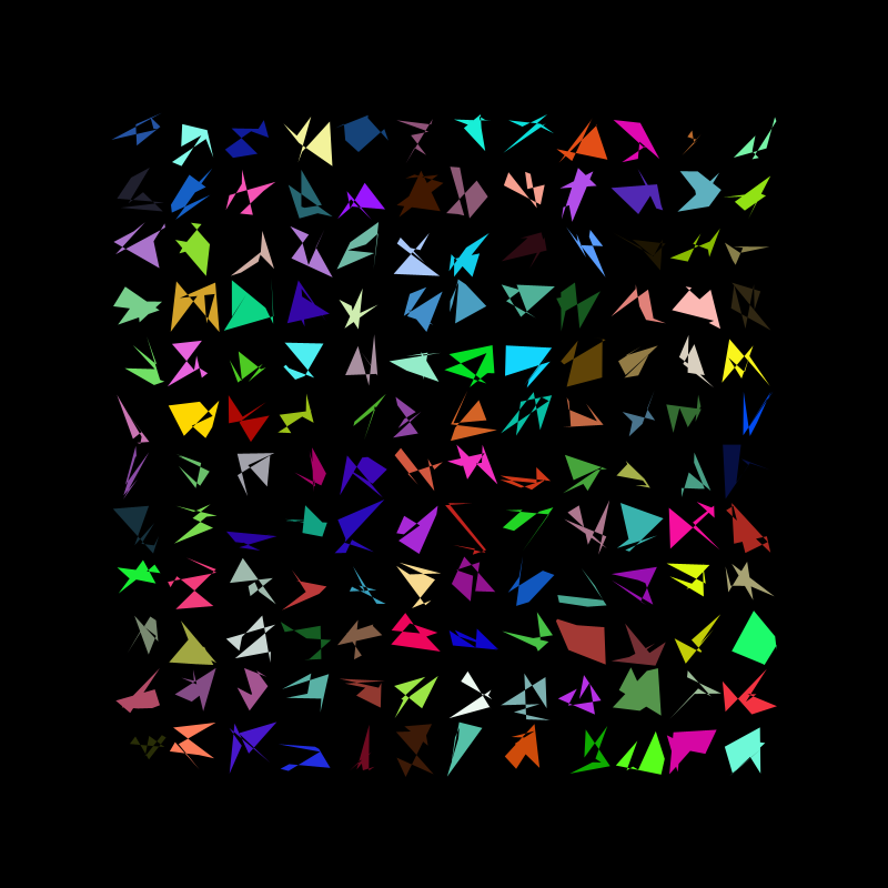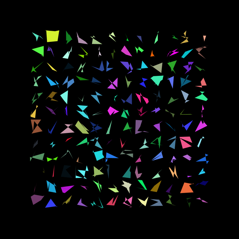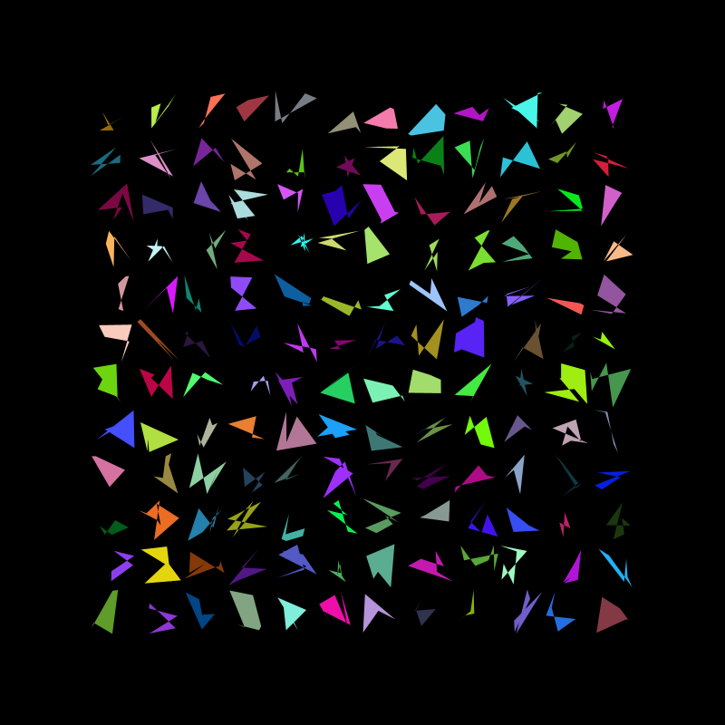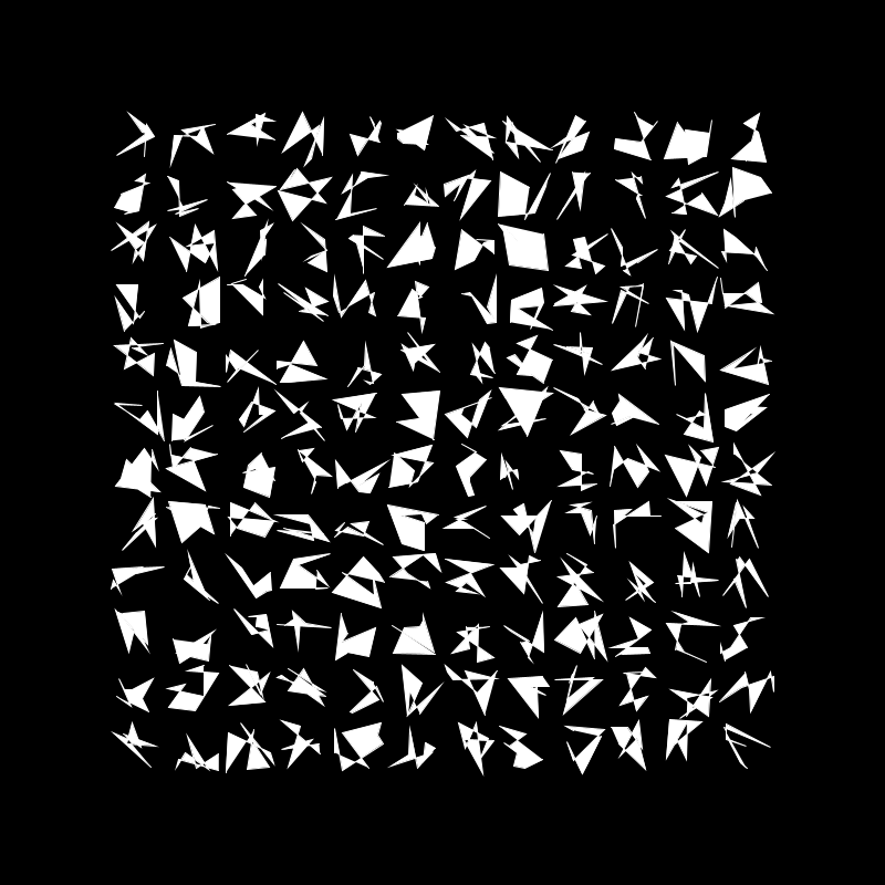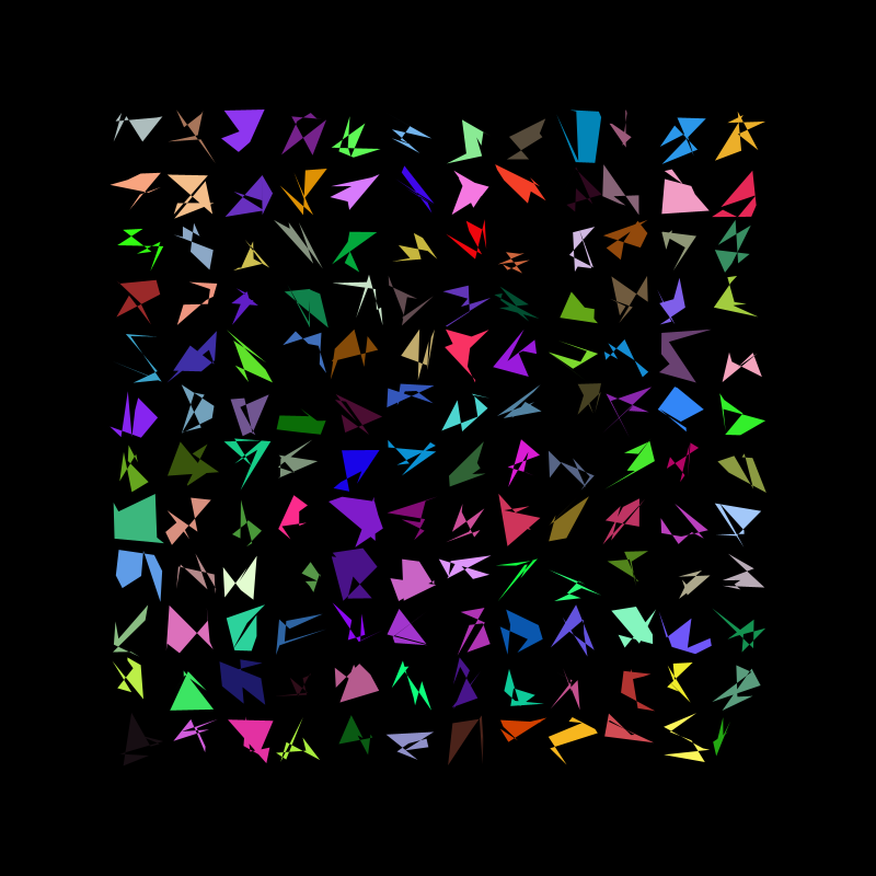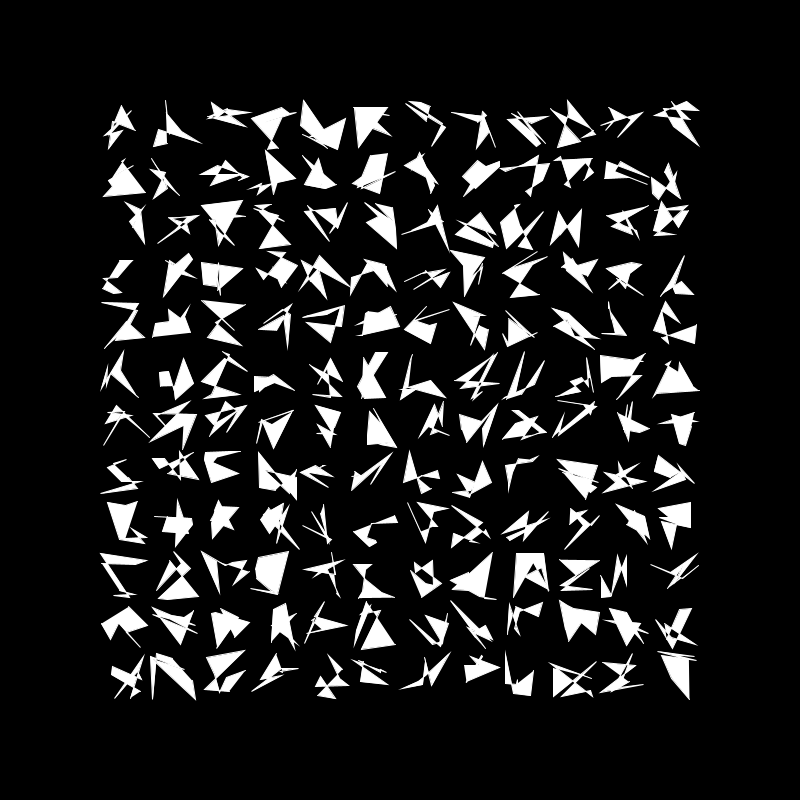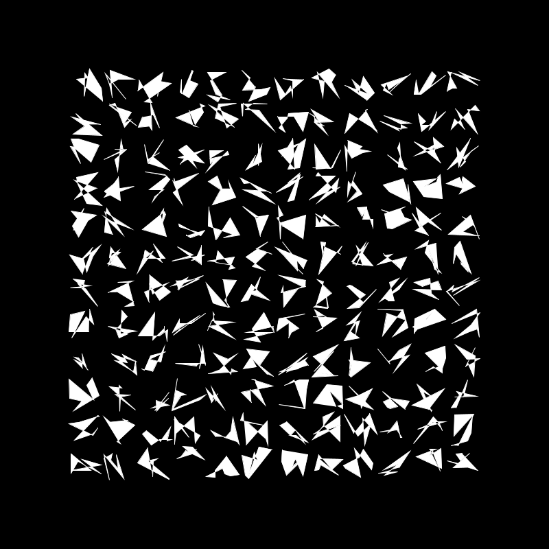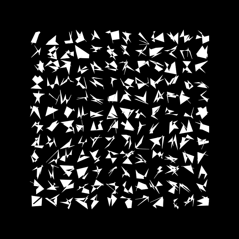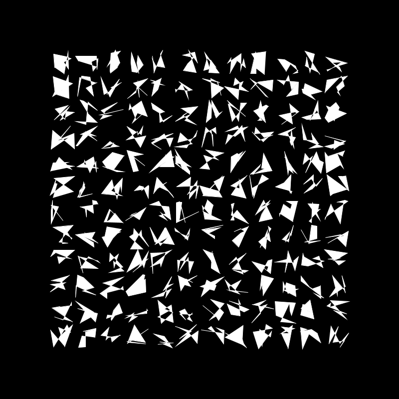 I really liked the way this came out, however I felt the grid was a bit crowed so I decided to add more randomness. This time each shape has a random number of vertex between 3 and 8