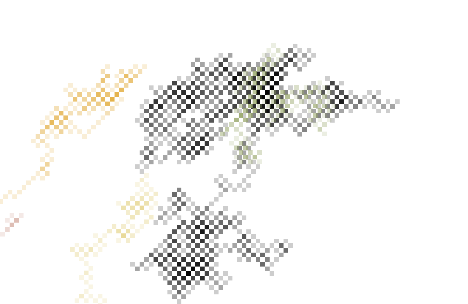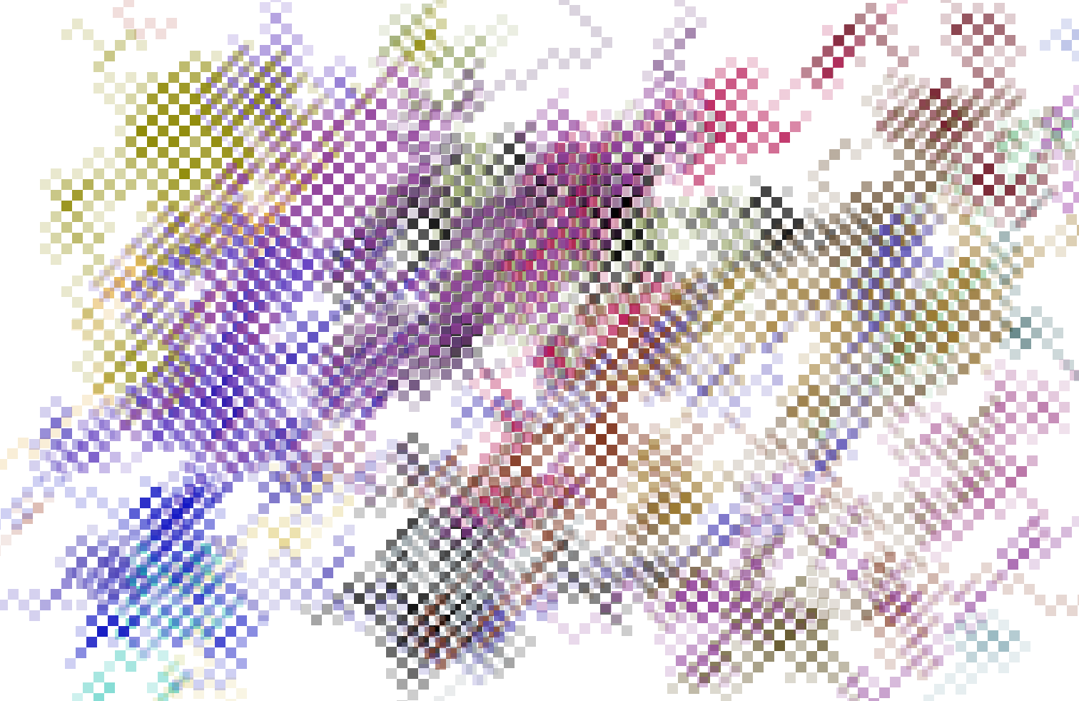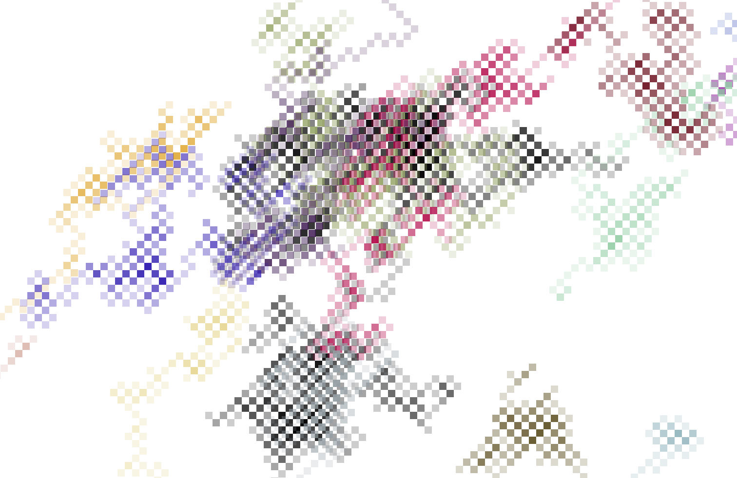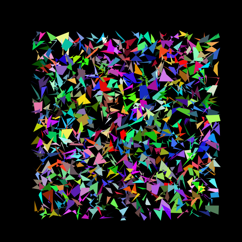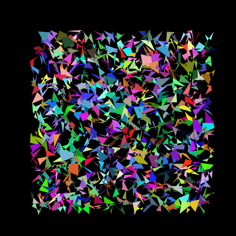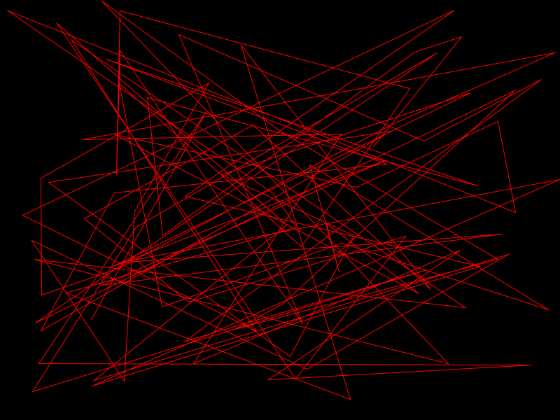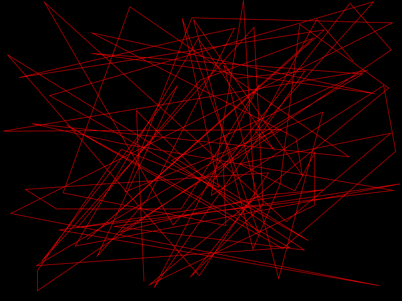 This sketch draws a sqaure and then another square from a random corner of the previous square. This “stepper” creates these interesting almost 3D checkerboard designs, as it runs if it “goes off the screen” it will (like the previous sketch) come back at a random point but also as a random colour. Above you can see how the program progresses with time.