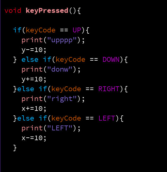 I wanted to try have more control over the images I was creating whilst implementing more logic into my programs. So I created this program where the circles are controlled by the user with the arrow keys. Again using opacity you get these “bolder” shapes when the circle stops. On the right is the logic used to control the circle.