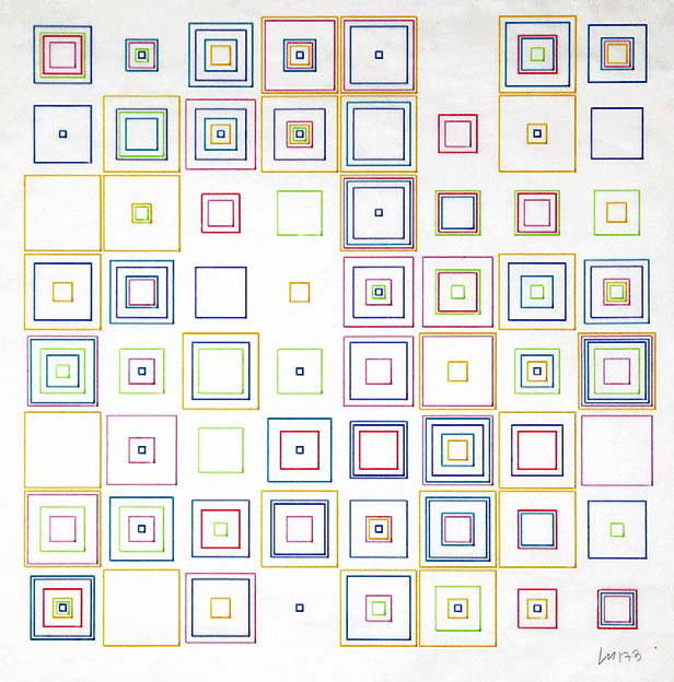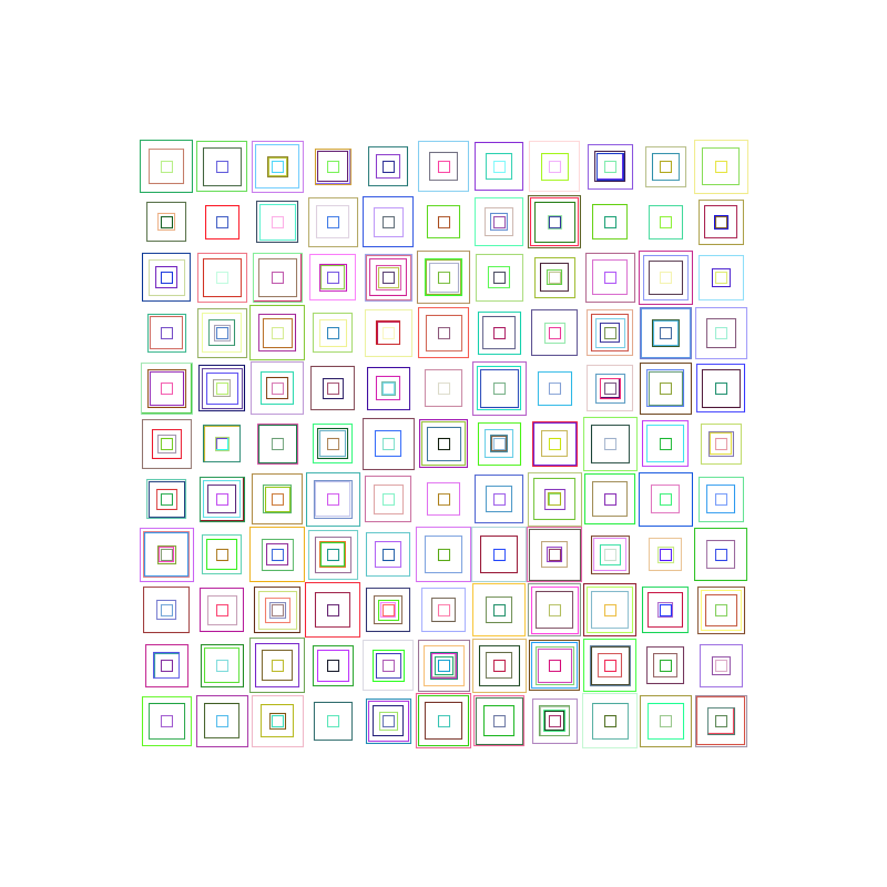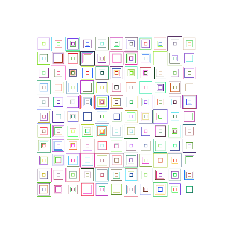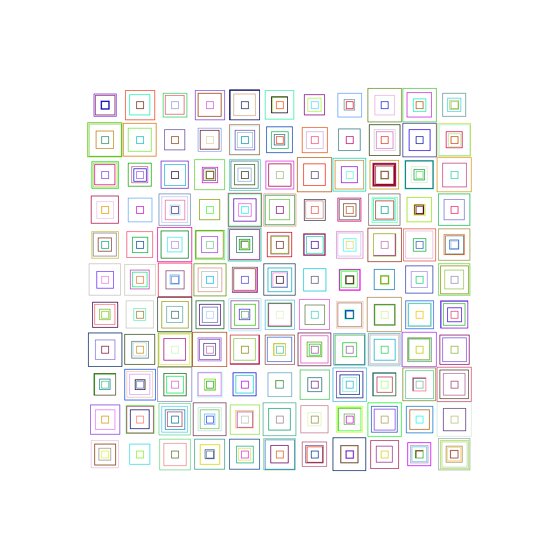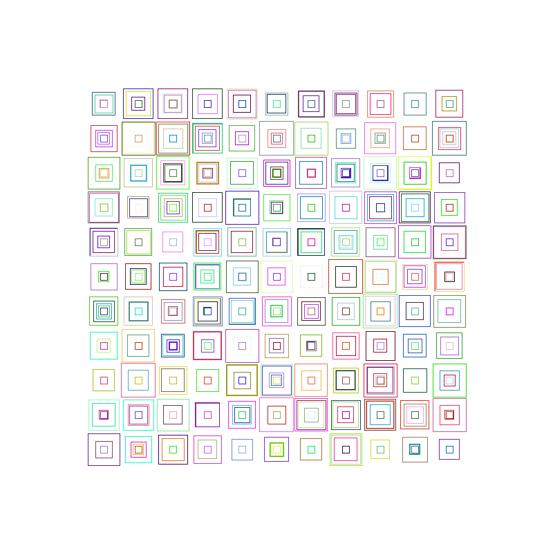 This was surprisingly easy using only 3 for loops to create a random amount of squares per cell of the grid. Each of the above a completely unique version.