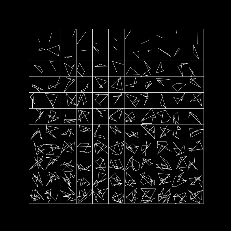 During Workshop 03 we explored loops, using them to create grids with the work of Vera Molnár as inspiration, example below: