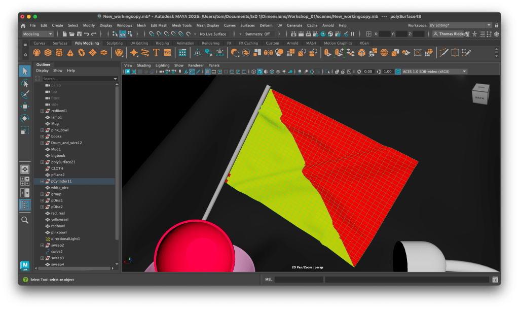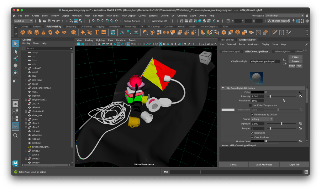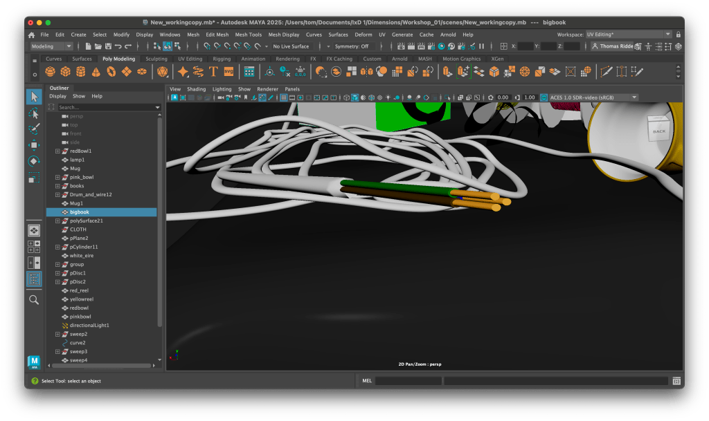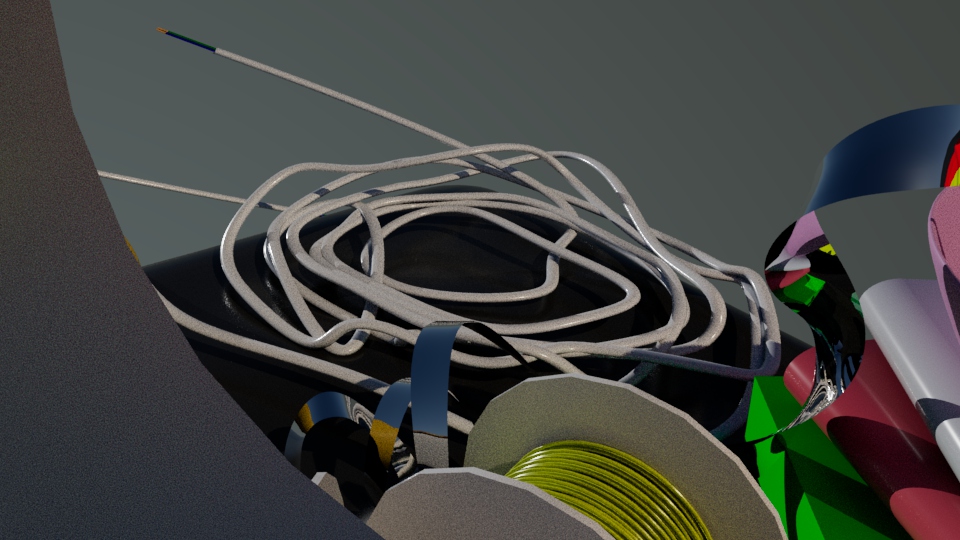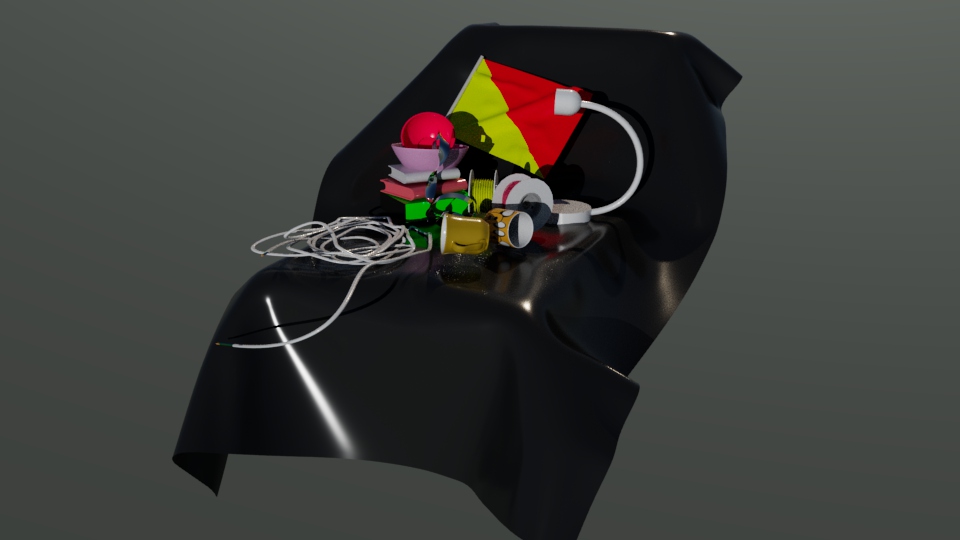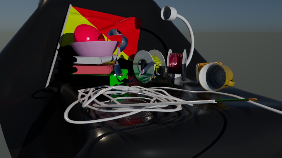 Now it was time to move onto modelling the scene which at first was laid out with a few simple objects, mugs, cables, etc. However after a few hours it was decided that this was not enough… I disagree. The flag was added as well as the silver tape and mugs were changed.