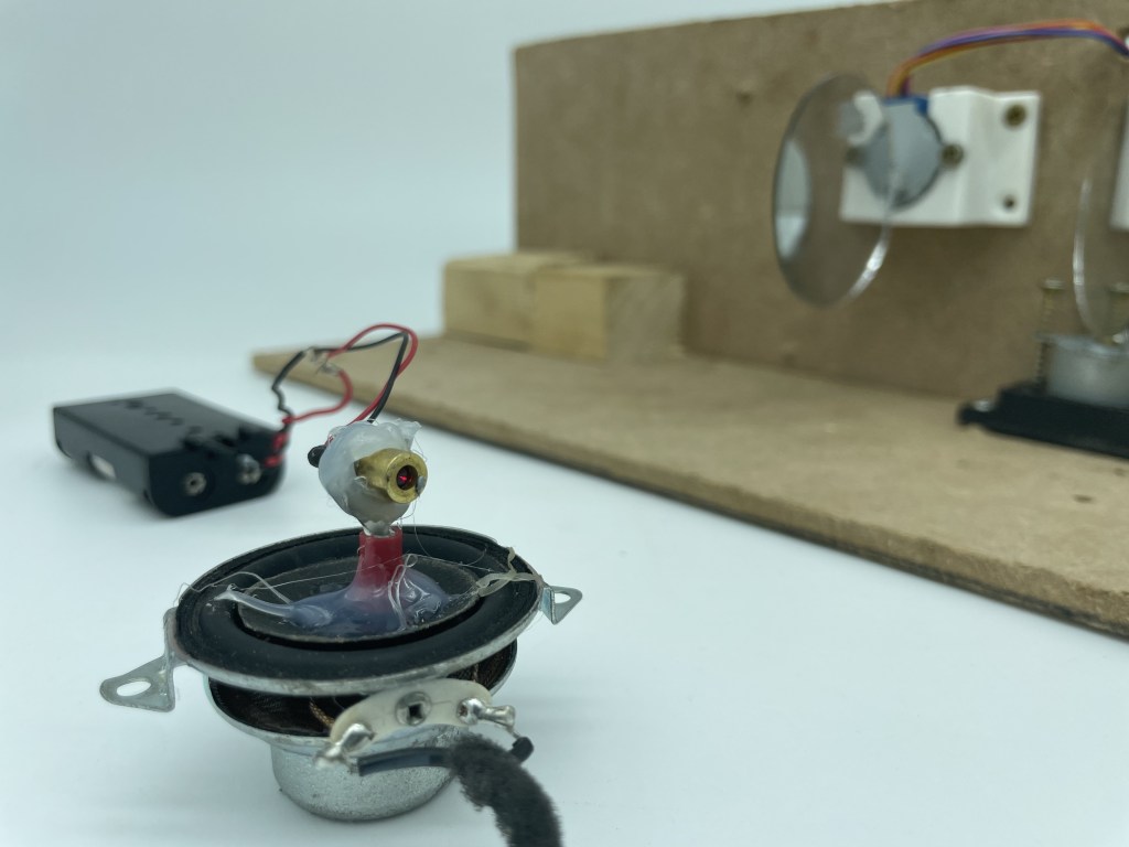 I started by simply attaching the laser to the cone of an old speaker I had and driving it with an amp in the studio. I was experimenting to see if I could in any way visualise the waveform of the sound by just playing a simple low frequency sine wave.