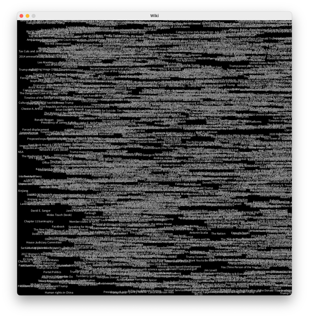 Inspired by the Wikipedia game I wanted to feed this data back into the program to start crawling through wikipedia. My version would get all the links from a “starting page” and pick one at random, go to that page and continue. This took alot of work to reformat the page titles and use URL encoding to be able to pass them back into my program, and after alot of tweaking I got it working just. There has been a continuous bug finding mission all week…